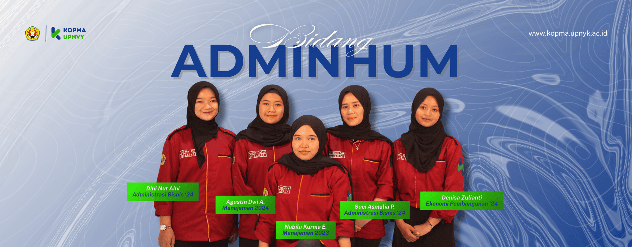 Bidang Adminhum pada periode 2025/2026 dibagi menjadi 2 sub bidang, yaitu administrasi dan humas. Dimana setiap sub bidang memiliki tugas yang berbeda dan bertanggung jawab atas kegiatan yang berbeda pula. Untuk sub bidang administrasi bertanggung jawab dalam surat menyurat, inventaris, dan penggunaan sekretariat Kopma UPN “Veteran” Yogyakarta. Sub bidang humas bertanggung jawab atas hubungan dengan pihak internal seperti birokrasi kampus maupun pihak eksternal seperti Dinas, UKM lain, FKKMI, HKMY, dan menghadiri undangan dari organisasi lain. Dalam bidang ADMINHUM periode 2025/2026 terdapat 2 sub bidang, antara lain: